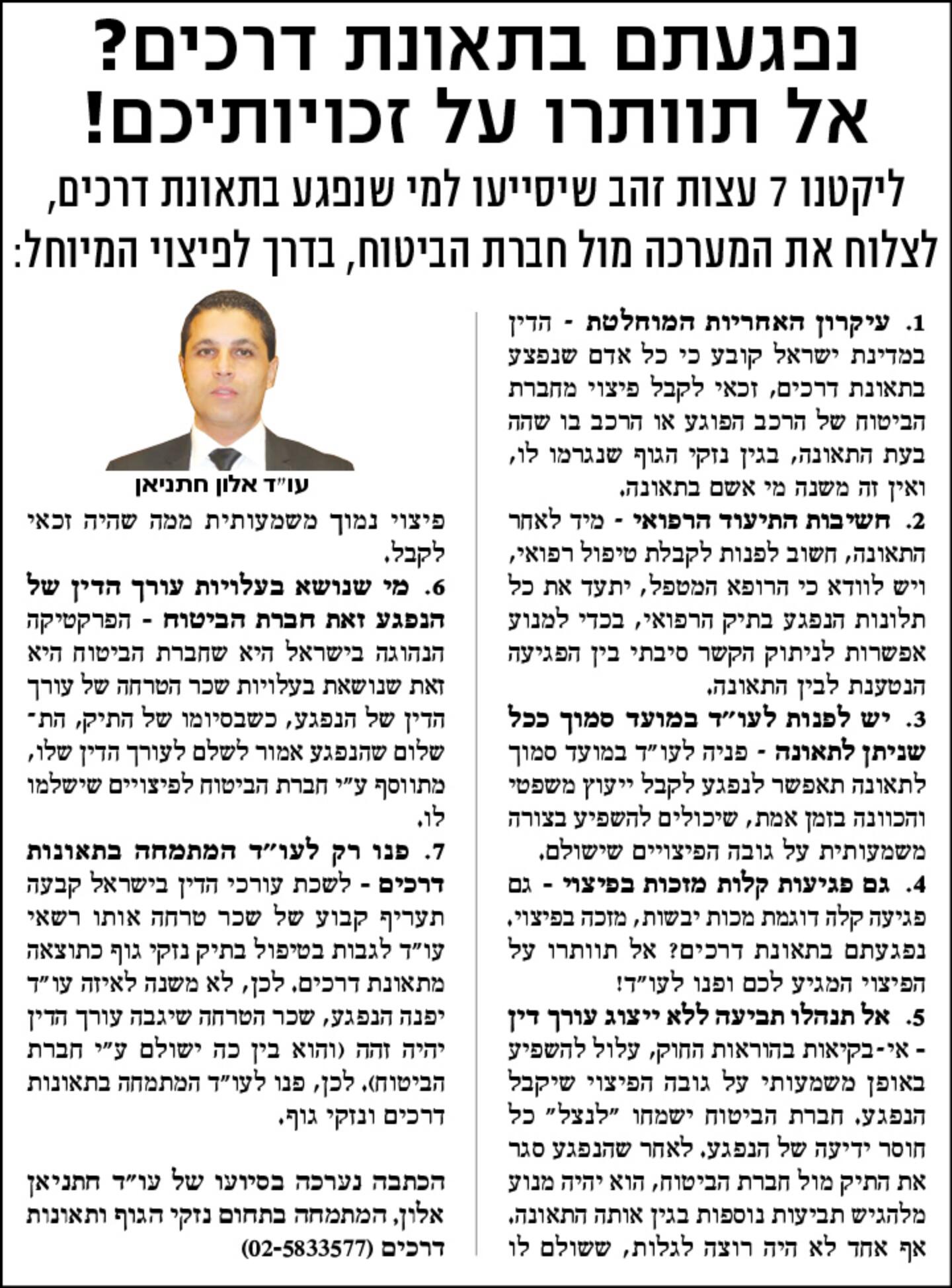 מדי שנה נהרגים בכבישי ישראל מאות בני אדם, ונפצעים עשרות אלפים. לצערנו, תאונות דרכים הפכו להיות חלק משגרת היומיום. ליקטנו עבורכם 7 עצות זהב שיסייעו לכם לצלוח את המערכה מול חברת הביטוח, בדרך לפיצוי המיוחל :
